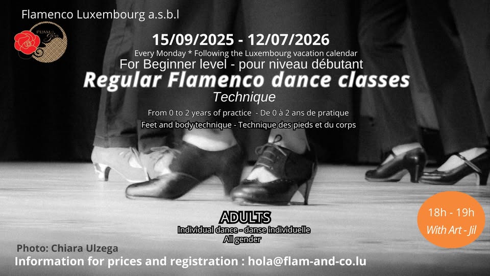 • 2025-10-20 18:00:00 2025-10-20 19:00:00 Europe/Paris Flamenco for Adults: Beginner: Technique (Monday) Weekly Flamenco dance classes for beginners. - Monday, 6:00–7:00 p.m. → Technique - Tuesday, 6:30–7:30 p.m. → Technique - Tuesday, 7:30–8:30 p.m. → Choreography - Thursday, 12:30–1:30 p.m. → Technique - Thursday, 6:30–7:30 p.m. → Sevillanas Flamenco is a solo dance requiring no partner, while Sevillanas can also be performed solo or in groups. Information on the difference between Technique and Choreography classes: - Choreography classes: Focus on exploring a specific rhythm (palo), learning its style, choreographic structure, and cultural codes, preparing participants to dance with live musicians. - Technique classes: Sessions focus on specific aspects such as footwork, arms and hands, turns, and body coordination adapting to participant levels. Weekend workshops are also offered with guest artists and special topics like compás, rhythm, improvisation, and body expression. 92 rue du dix octobre Flamenco Luxembourg a.s.b.l