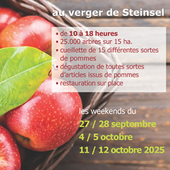 • 2025-10-11 10:00:00 2025-10-11 18:00:00 Europe/Paris Äppelfest - Apple Festival Autumn marks the return of the traditional Apple Festival organized by the Steinsel orchard on the weekend of October 11 and 12. On this occasion, the general public is invited to come and pick apples directly from the orchard, which has nearly 25,000 trees spread over 15 hectares. This year, fifteen varieties of apples will be available for picking. Tastings of apple products will be offered. On-site catering will allow visitors to fully enjoy this friendly outing. A key event of the season, the Steinsel Apple Festival attracts several thousand visitors each year, who come to celebrate the richness of the land and the pleasure of harvesting outdoors. Vergers de Steinsel, Rue des Champs, Steinsel, Luxembourg Commune de Steinsel