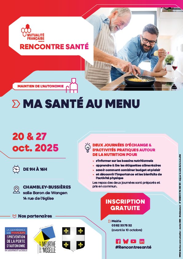 The Mutualité Française Grand Est organizes workshops titled "My Health on the Menu" on the 20th and 27th of October 2025 at the communal hall in Chambley-Bussières. These days include cooking sessions in the morning, meals prepared and shared at noon, followed by workshops on nutrition and physical activity in the afternoon.