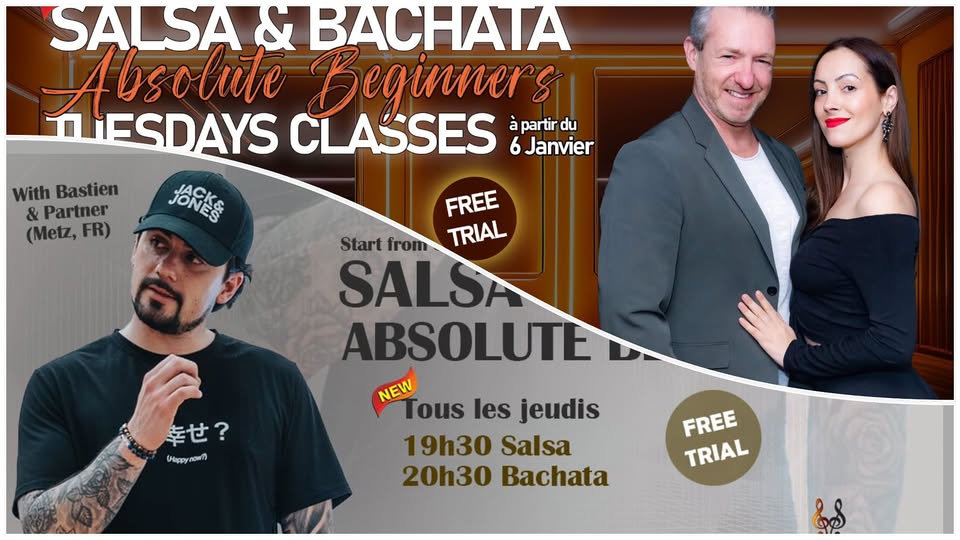 • 2026-01-06 19:15:00 2026-01-15 21:30:00 Europe/Paris New Salsa and Bachata, Absolute Beginners in Lux-City. Free Trial, Open Doors. Tuesdays & Thursdays Join and try for free our new Salsa and Bachata dance classes for absolute beginners. Come alone or as a couple, you can try all of them for free once before deciding to subscribe. Athletic Center Luxembourg Alkemia Dance School