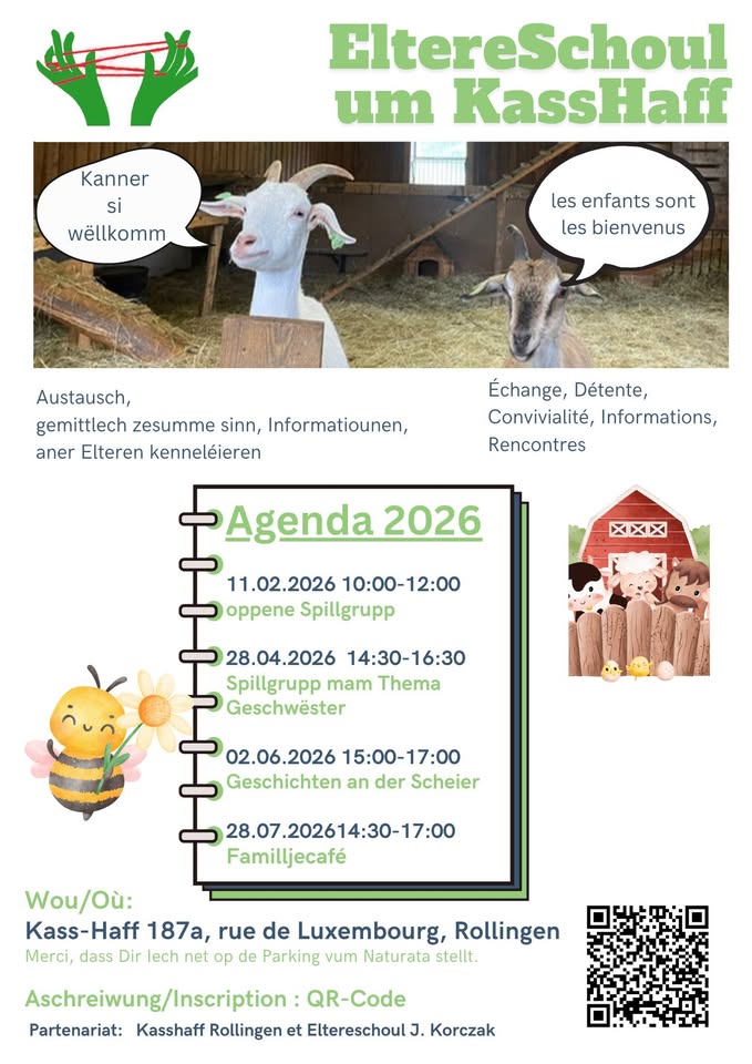 Location: Kass-Haff, Rollingen/Mersch, 187a, rue de Luxembourg. Registration: QR code or website kannerschlass.lu. Group open to parents and children, activities in FR/LU/EN.