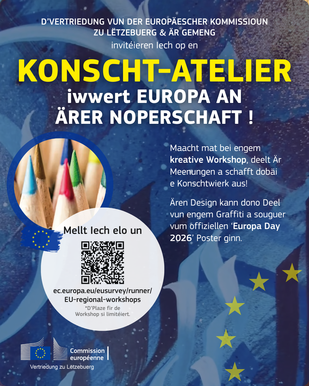 • 2026-01-29 18:00:00 2026-01-29 20:00:00 Europe/Paris Creative workshop (LU) - A Campaign Built Together Your ideas, your region, your EU What does Europe look like when it grows from the ground up? This campaign starts from a simple premise: the EU is present in everyday life everywhere, not just in the capitals and decision-making centers. From agriculture and environmental protection to mobility and local development, the EU plays a role in many aspects of rural life. And rural communities aren’t just benefiting from EU action – they are actively helping shape Europe’s present and future. Over the coming weeks, the Representation of the European Commission in Luxembourg together with the municipalities will host a series of creative workshops in different communes across the country. These workshops are open spaces for dialogue, expression, collaboration and co-creation. Participants will be invited to share their ideas, stories, and concerns, and to explore how these can be translated into (audio)visual messages. No prior artistic experience is needed—what matters is your perspective and your willingness to take part! DATES OF UPCOMING WORKSHOPS January 26 - Mertzig January 28 - Esch-sur-Alzette January 29 - Dudelange February 2 - Bissen If you are curious, creative, or simply interested in having your say, we invite you to join one of the upcoming workshops. Your ideas can help shape public spaces—and the conversation within them. 4 Pl. de l'Hôtel de Ville, 3590 Dudelange, Luxembourg Commission Européenne au Luxembourg