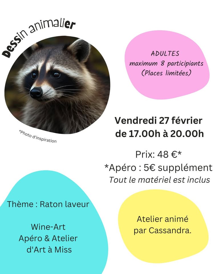 Under the guidance of Cassandra Bizzini, animal portrait artist, learn to master the art of realistic drawing while having fun in a friendly atmosphere. The theme of this workshop: the raccoon. You will explore creating textures and contrasts to bring your drawing to life; no prior knowledge is required. This creative session also includes an aperitif and a glass of wine. A perfect moment to relax, learn, and share with friends.