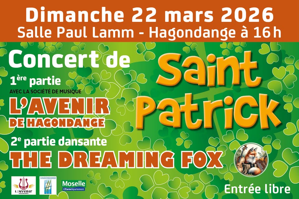 • 2026-03-22 16:00:00 2026-03-22 17:00:00 Europe/Paris Saint Patrick's Concert - L'Avenir de Hagondange In the first part, L'Avenir de Hagondange will open the concert and offer you a festive program to kick off the celebrations. In the second part, the group The Dreaming Folks will immerse you in the warm and lively atmosphere of traditional Irish music. A wonderful opportunity to enjoy a friendly moment with family or friends! Salle des fêtes Paul Lamm, Rue Henri Hoffmann, Hagondange, France Société de musique l'Avenir