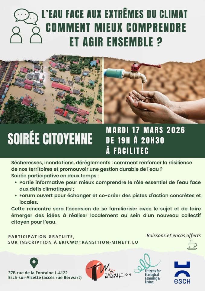 • 2026-03-17 19:00:00 2026-03-17 20:00:00 Europe/Paris Citizen evening: Water and climate extremes – how can we better understand and act together? The aim of this citizen evening is to explore and better understand the essential role of water regarding today’s climate change challenges. Water shapes our ecosystems, supports biodiversity and plays a key role in our daily lives. During drought it becomes precious, while in floods it can destabilize communities. In the face of these challenges, we share a common responsibility to promote sustainable water management, improve the resilience of our societies and think of solutions to better protect this vital element. The evening includes: - An informative session with scientific input - A co-creation workshop in an open forum format It is an opportunity to co-create ideas to be implemented by a new citizens’ collective for water. The process may continue at the Citizen Climate Forum. Facilitec Tiers-Lieu Mesa, la maison de la transition