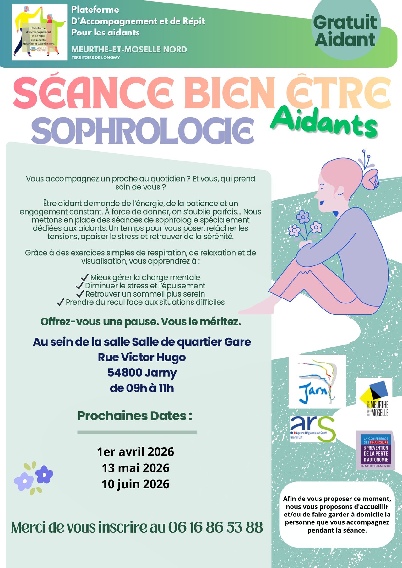You spend a lot of time supporting a loved one, but who takes care of you? Treat yourself to a moment of relaxation during sophrology sessions: a space to release tension, ease stress, and regain peace of mind.