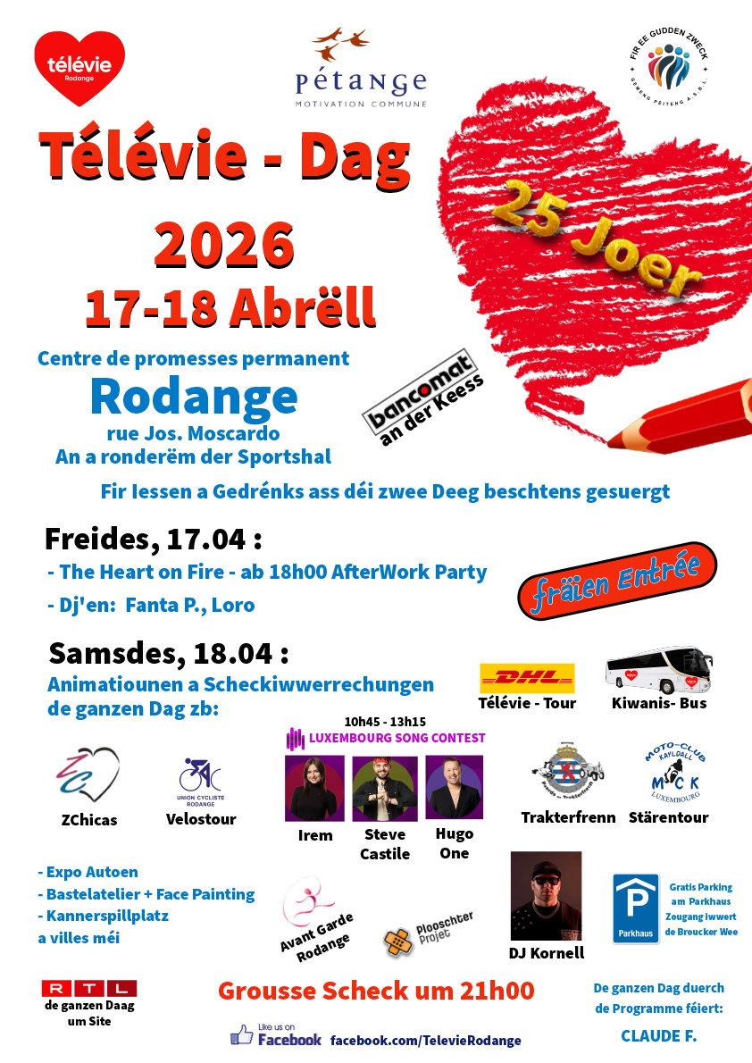 • 2026-04-18 09:00:00 2026-04-18 10:00:00 Europe/Paris Television Day 2026 Television Day 2026 Rue Jos Moscardo, 4741 Rodange Pétange, Luxembourg Commune de Pétange