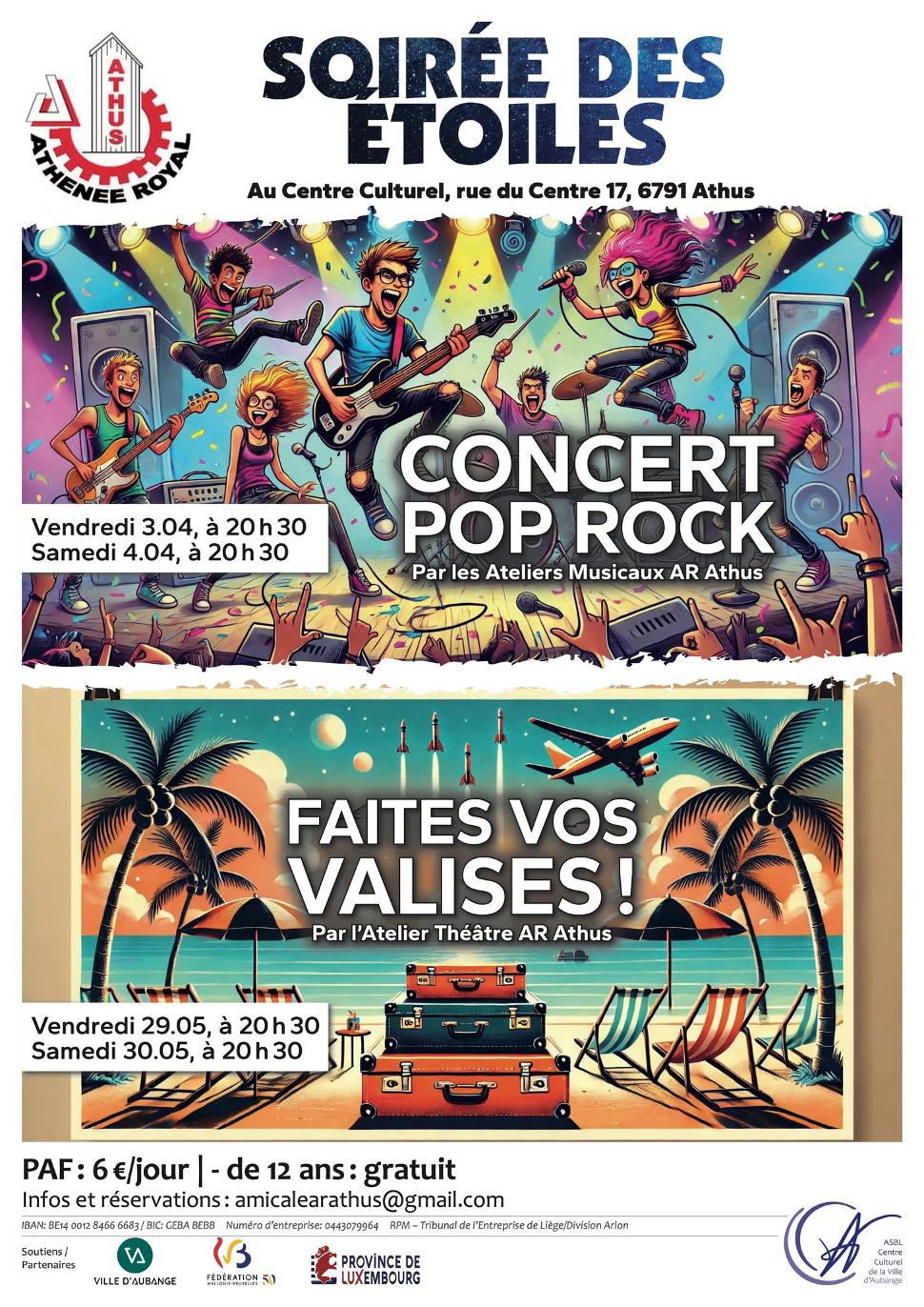 • 2026-04-03 20:30:00 2026-04-03 21:30:00 Europe/Paris Soirée des étoiles - concert Pop Rock Concert in Athus! The music workshop of the 'Soirée Des Étoiles' from Athénée Royal d’Athus invites you to a musical journey, the result of a year of rehearsal. The students have worked on various covers in very different styles and are proud to present them to you. From Bruno Mars to Billie Eilish, from Guns N’ Roses to Rihanna and Tool, join us on a musical journey... Rue du Centre 17, 6791 Aubange, Belgique