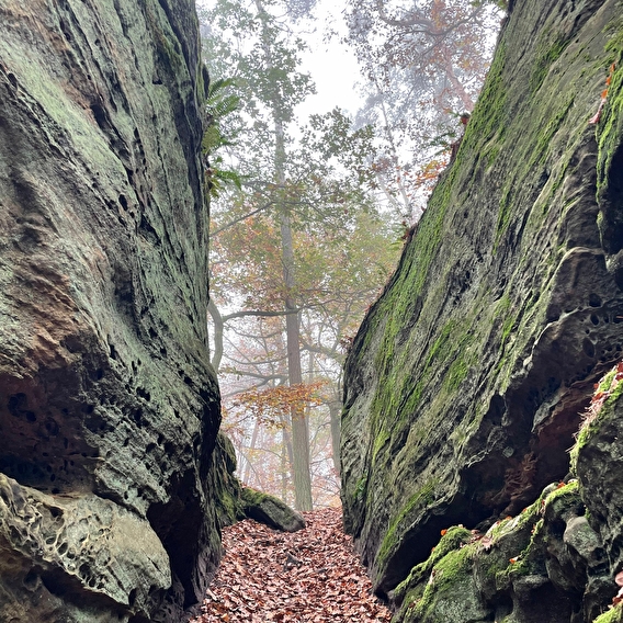 The path then continues flat through the forest towards Kaasselt, offering a charming panorama over the valley. Along the way, discover the Mandrack passage, an impressive rock fissure, before reaching the Kalekapp viewpoint. After the rocks of Rammelee, enjoy the view of Echternach from Geierslee, before closing your loop by skirting the rocks of Zigeinerlee.