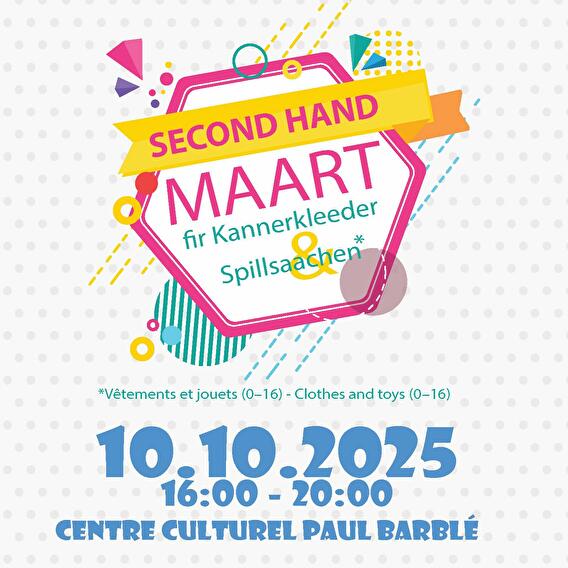 • 2025-10-10 16:00:00 2025-10-10 20:00:00 Europe/Paris Marché de seconde main pour tes enfants Vendredi 10 octobre, le Centre culturel Paul Barblé à Strassen t'accueille pour un marché rempli de vêtements et jouets pour enfants de 0 à 16 ans. Viens chiner et repars avec des trésors pour tes petits ! Centre Culturel Paul Barblé, Rue des Romains, Strassen, Luxembourg Commune de Strassen