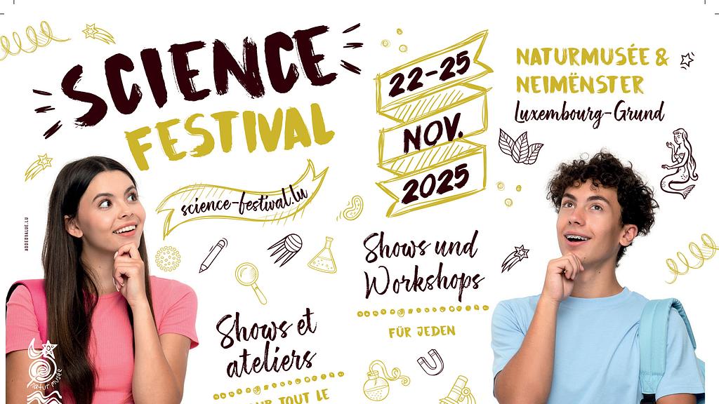 • 2025-11-25 14:00:00 2025-11-25 16:15:00 Europe/Paris Science Festival 11-18 ans Cette année, c'est reparti ! SCIENCE FESTIVAL au Musée d'histoire naturelle avec des spectacles et des ateliers pour tous. Nous visiterons différents stands du Science Festival pour faire des expériences de tout genre. 25 Rue Münster, 2160 Grund Luxembourg Musée national d'histoire naturelle (MNHN)
