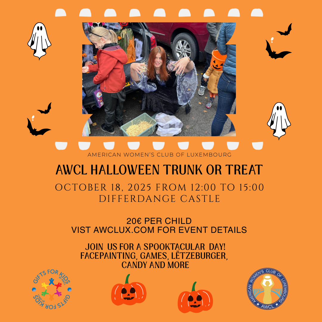Rejoignez l'AWCL pour un après-midi spooktaculaire rempli de plaisir en famille ! Parcourez une file de coffres de voiture décorés avec goût, collectez des friandises sucrées et plongez dans la magie d’Halloween. Les enfants apprécieront les peintures faciales et les jeux, tandis que tout le monde pourra se régaler avec les plats des foodtrucks, les délices faits maison et bien sûr, beaucoup de bonbons. Une occasion effrayante et amusante pour toute la famille !