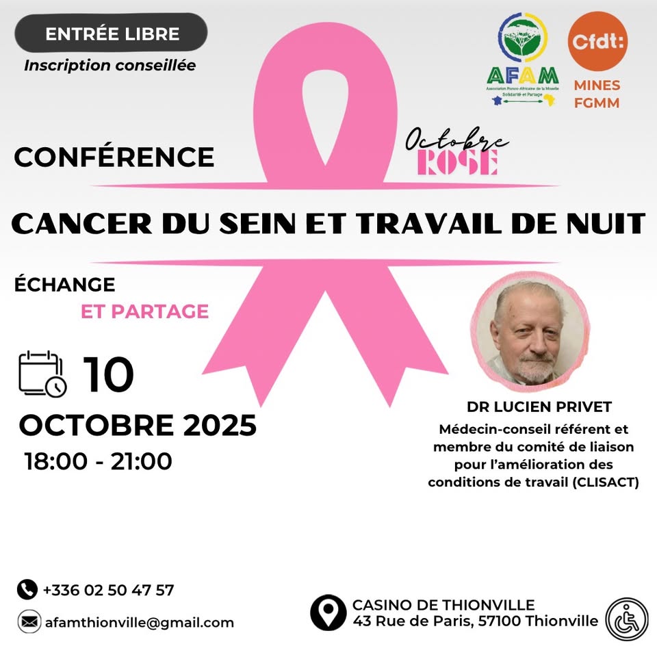 • 2025-10-10 18:00:00 2025-10-10 21:00:00 Europe/Paris Cancer du sein et travail de nuit L’AFAM et la CFDT des mineurs de la Moselle organisent une conférence-débat animée par le Dr Lucien Privet. Cette rencontre aborde le lien potentiel entre le travail de nuit et le cancer du sein. Au programme : explications médicales, échanges avec le public et des conseils pratiques, dans un cadre informatif et bienveillant. Casino Municipal, Rue de Paris, Thionville, France Ville de Thionville