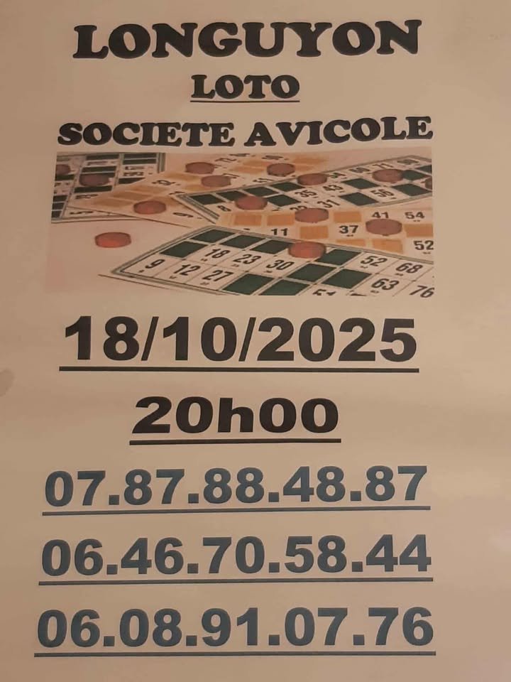 Rejoignez-nous pour le Grand Loto organisé par les aviculteurs de Longuyon. Cet événement se tiendra à la Salle Brassens avec de nombreux lots à gagner et une tombola. Profitez de la buvette et de la petite restauration sur place.