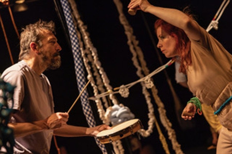 Ils sont nombreux, ces fils qui nous attachent à la vie, nous relient entre nous, que l'on doit rompre ou affronter pour grandir. Cordon ombilical, lacets que l'on apprend à nouer, échelles de corde des squares, rubans et autres ficelles... C'est la grammaire du lien que décline ce spectacle à travers diverses installations cinétiques et sonores. Sur le plateau, les tout-petits se laissent entraîner au sein d'un entrelacs poétique par les artistes de tous horizons (musiciens, plasticiens, danseurs). Avec eux, la joie ne tient vraiment qu’à un fil.
