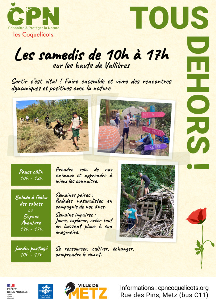 • 2025-11-29 10:00:00 2025-11-29 17:00:00 Europe/Paris Samedi Tous Dehors ! Chaque samedi matin, participez à la Pause Câlin pour découvrir et soigner nos animaux. Les après-midis des semaines paires, partez en promenade ludico-naturaliste "À l'Écho des sabots" avec un âne bâté pour explorer les environs des Hauts de Vallières. Les après-midis des semaines impaires, profitez de l'Espace Aventure : un lieu immersif et créatif pour les jeunes. Les enfants doivent être accompagnés d'un adulte. Rue des Pins, 57070 Metz, France Tourisme Metz