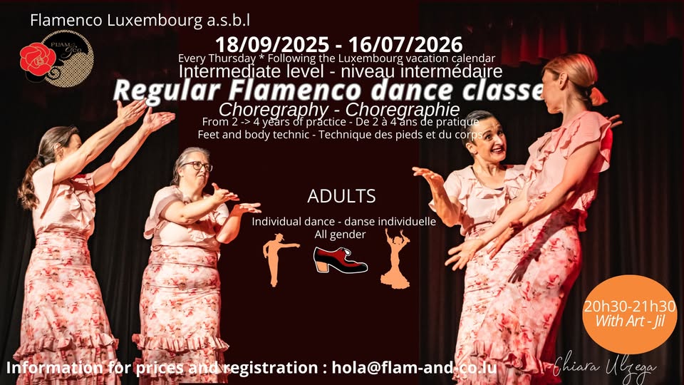 Cours hebdomadaires de danse flamenco pour niveau intermédiaire, comprenant des sessions techniques et de chorégraphie. Les cours visent à développer les compétences techniques et artistiques des participants.