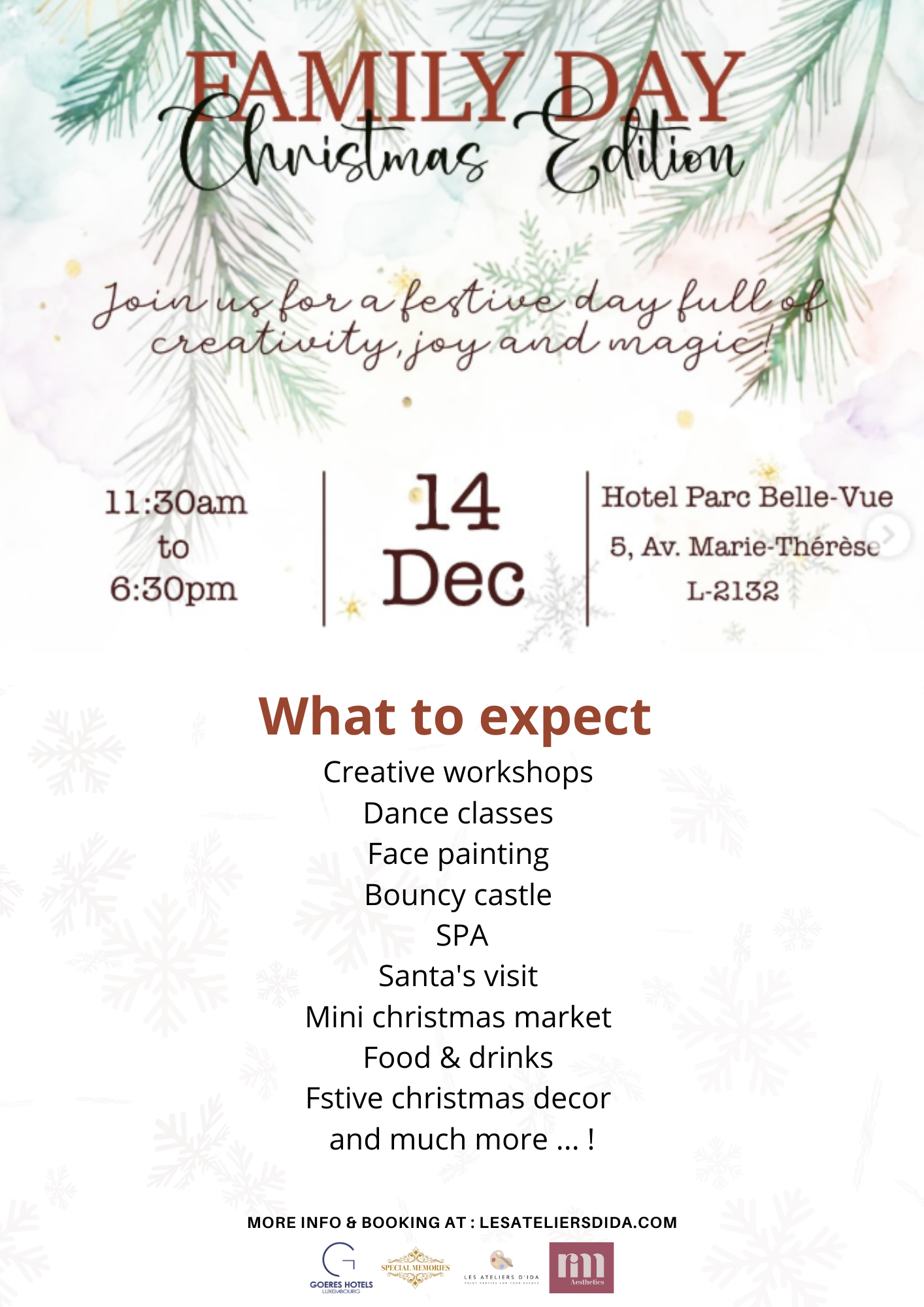 • 2025-12-14 11:30:00 2025-12-14 18:30:00 Europe/Paris Family Day - Christmas Edition Une Journée de Noël Magique en Famille – À Ne Pas Manquer ! Préparez-vous à vivre une expérience féerique où notre Family Day se transforme en un véritable voyage de Noël rempli de joie, de rires et de moments inoubliables. Venez en famille profiter d’une journée pensée pour le fun, le partage et la magie des fêtes. 🎟️ Inclus dans votre billet • Session de danse spéciale Noël • Mini marché de Noël • Château gonflable • Espace bébé chaleureux • Atelier créatif inspirant • Visite joyeuse du Père Noël Hôtel Parc Belle-Vue, Avenue Marie-Thérèse, Hollerich, Luxembourg Hôtel Parc Belle-Vue