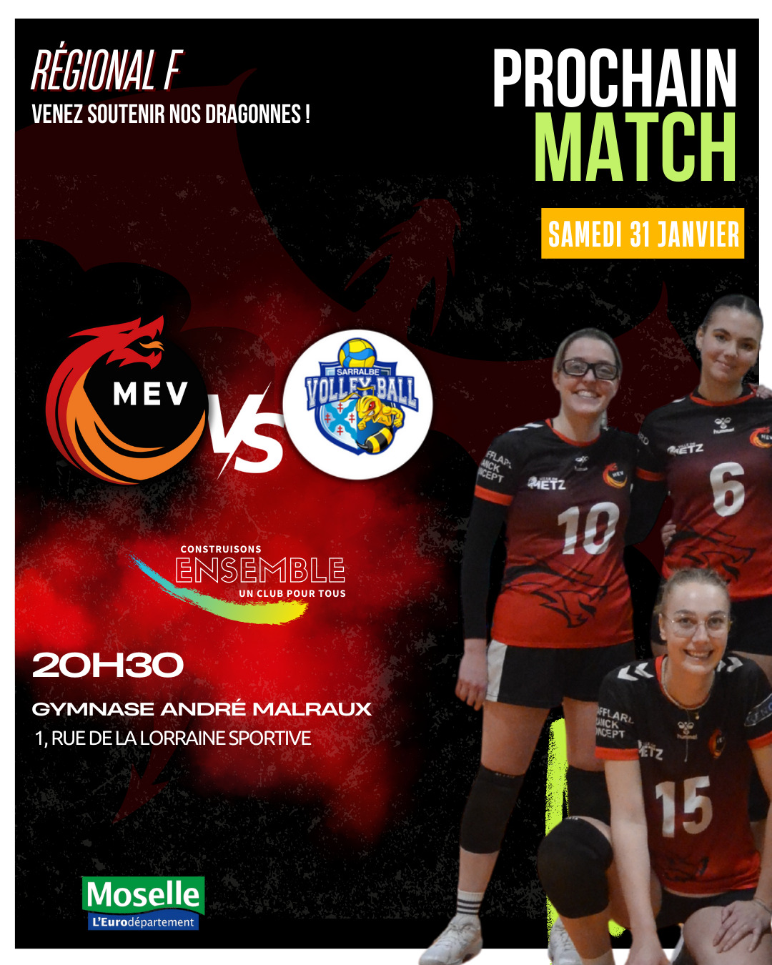 Les Messines vous donnent rendez-vous pour la réception de Sarralbe. Victorieuses 3-0 lors du match aller, les Dragonnes auront à cœur de confirmer leur solidité et de poursuivre leur belle dynamique devant leur public. Les Rouges comptent sur le soutien des tribunes pour faire la différence à la maison. Allez les Rouges ! Ensemble, faisons rugir les Dragonnes !