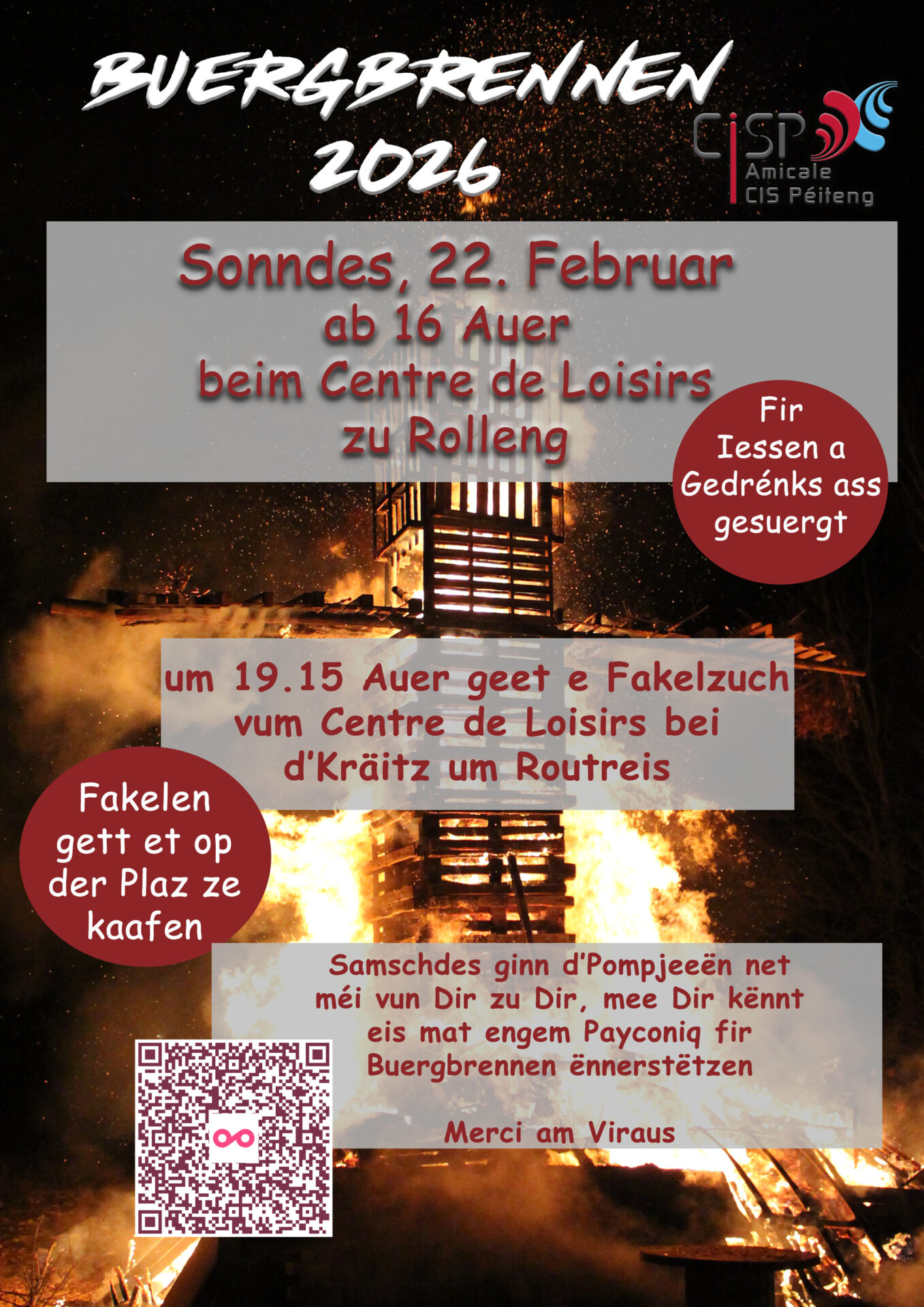 • 2026-02-22 16:00:00 2026-02-22 17:00:00 Europe/Paris Buergbrennen Buergbrennen Centre de loisirs Lamadelaine, Grousswiss, Lamadelaine Péiteng, Luxembourg Commune de Pétange