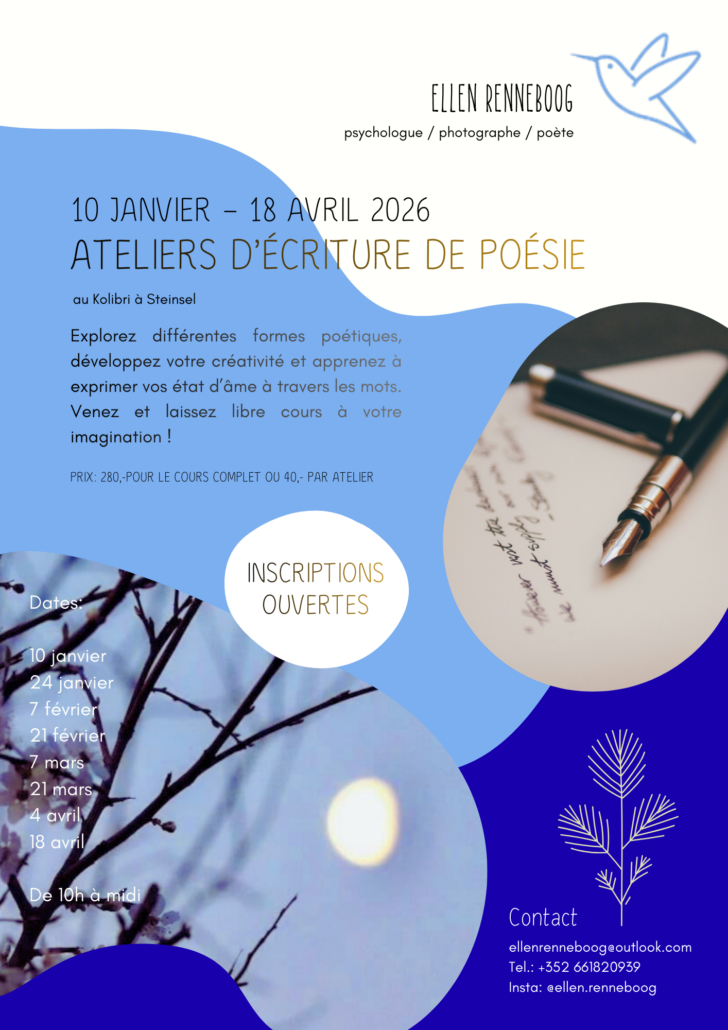 • 2026-02-07 10:00:00 2026-02-07 12:00:00 Europe/Paris Ateliers d’écriture de poésie Ateliers d’écriture de poésie 2 Mnt Willy Goergen, 7322 Steinsel, Luxembourg Commune de Steinsel