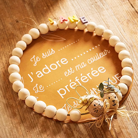 Rejoignez-nous en atelier déco pour créer une réalisation unique qui plaira à tous les enfants. Sur une base de cercle métallique, votre enfant pourra choisir le fond de sa création ainsi qu'une jolie guirlande de perles en bois naturelle. Une fois cette base construite, nous nous intéresserons à la jesmonite pour créer de petites lettres colorées et constituer un prénom ou un mot à coller sur sa création. Pour finir, votre tout petit pourra créer de petits personnages et autres petites déco à rajouter sur le contour de sa suspension.