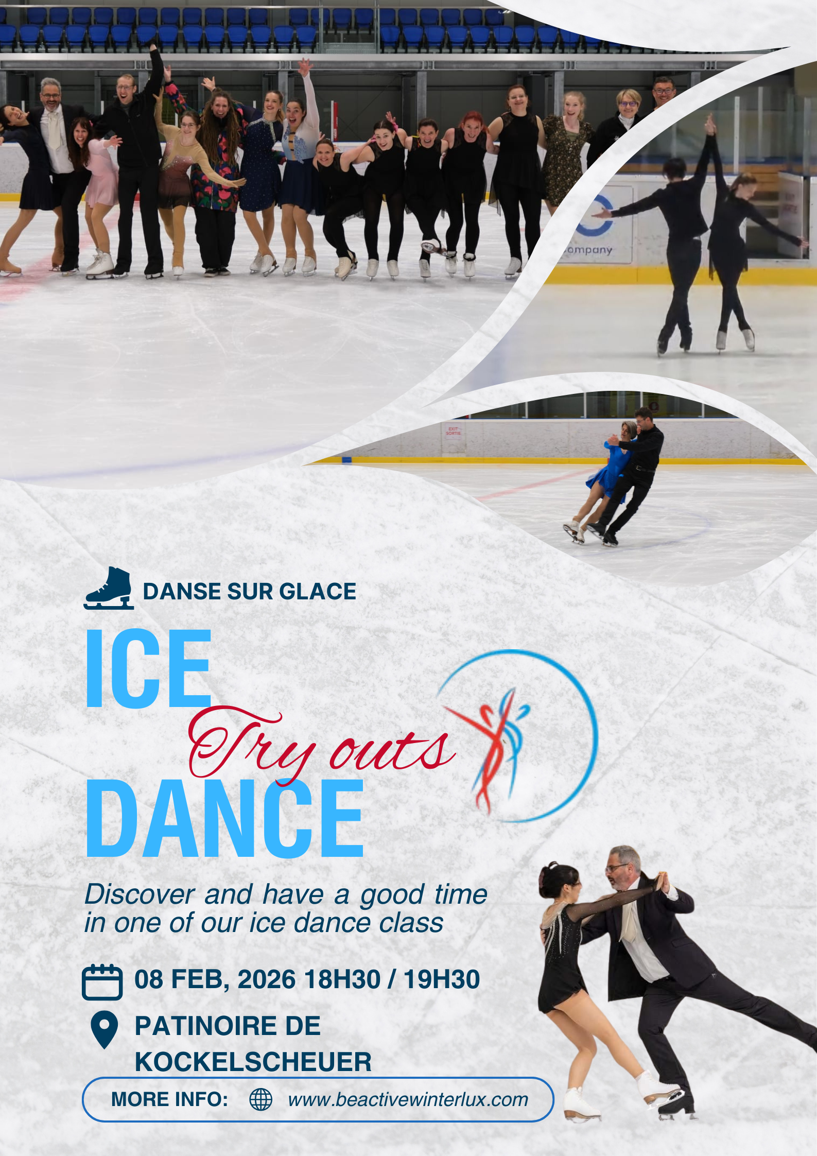 • 2026-02-08 18:30:00 2026-02-08 20:30:00 Europe/Paris Ice Dance tryouts DANSE SUR GLACE – ESSAIS Avez-vous déjà rêvé de danser sur glace ? Venez découvrir la danse sur glace et profiter d'une séance amusante et élégante sur la patinoire avec notre communauté passionnée. Pas de pression, juste du mouvement, de la musique et de la bonne humeur — que vous soyez curieux, expérimenté ou simplement à la recherche de quelque chose de nouveau ! 🎶 Découvrez • Bougez • Amusez-vous Rejoignez-nous et laissez-vous emporter par le rythme de la danse sur glace ! Patinoire Kockelscheuer, Rue de Bettembourg, Gasperich, Luxembourg Patinoire Kockelscheuer