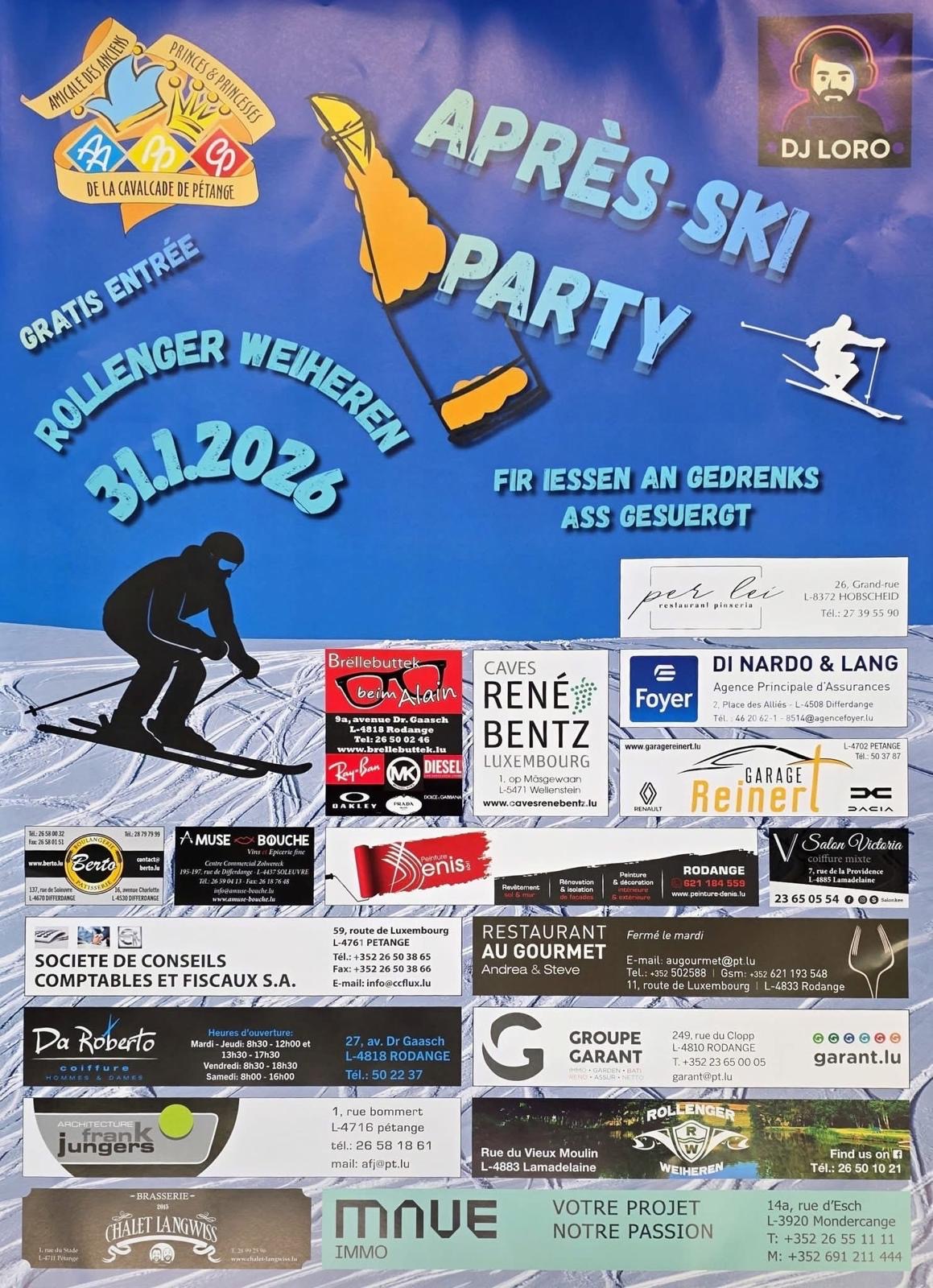 • 2026-01-31 18:00:00 2026-01-31 19:00:00 Europe/Paris Après-Ski Party Après-Ski Party Rue du Vieux Moulin, 4883 Lamadelaine Pétange, Luxembourg Commune de Pétange