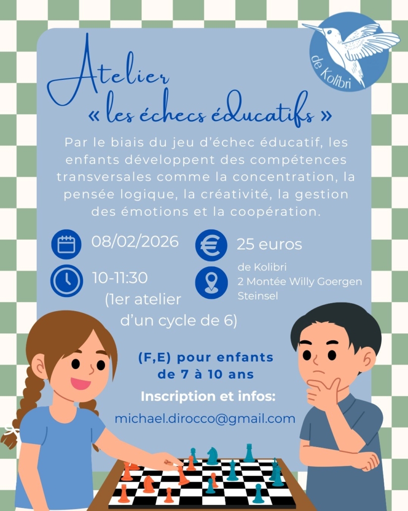 • 2026-02-08 10:00:00 2026-02-08 11:30:00 Europe/Paris Atelier « les échecs éducatifs » Atelier « les échecs éducatifs » 2 Mnt Willy Goergen, 7322 Steinsel, Luxembourg Commune de Steinsel