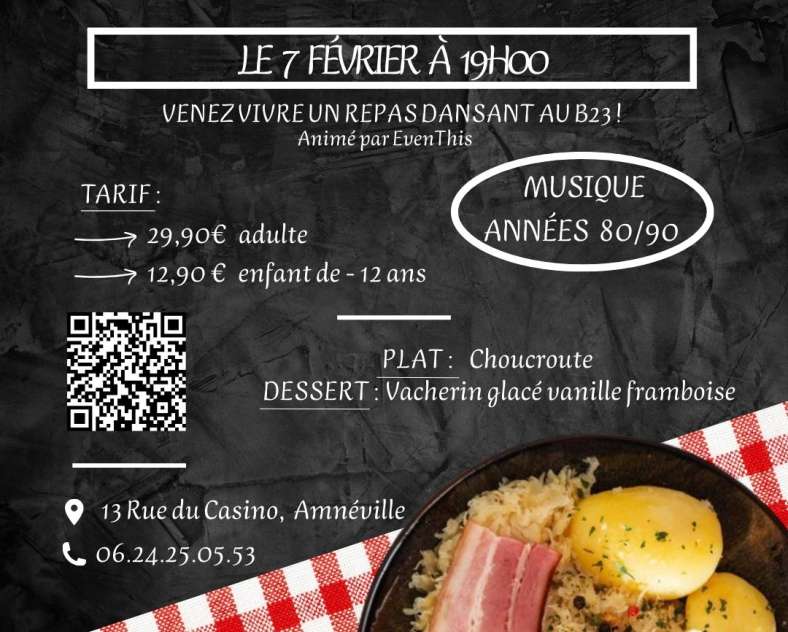 Préparez-vous pour une soirée gourmande et festive ! Le B23 à Amnéville vous invite à vivre un repas dansant autour d’une délicieuse choucroute traditionnelle, dans une ambiance conviviale et chaleureuse. Ambiance musicale années 80/90 pour chanter, danser et revivre les meilleurs souvenirs !