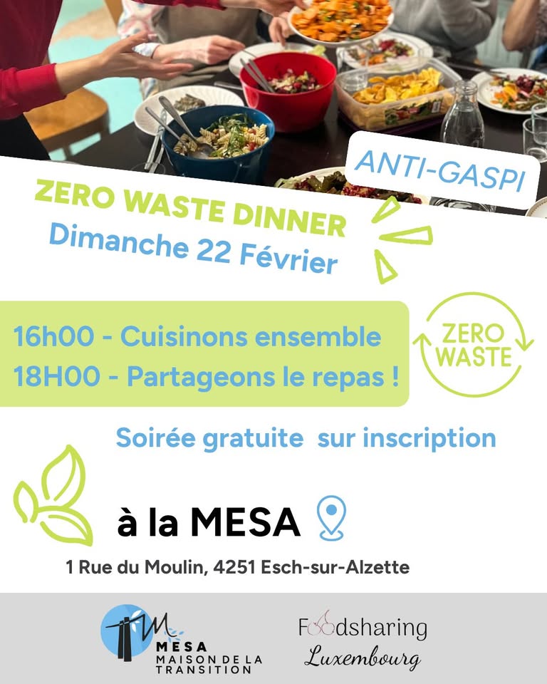 30 % de la nourriture produite dans le monde est gaspillée… Pour lutter contre cette réalité, Foodsharing Luxembourg organise en collaboration avec Transition Minett des repas partagés, où chacun·e peut venir cuisiner des aliments récupérés par Foodsharing dès 17h. Un grand repas est préparé et nous mangeons ensemble vers 19h dans une ambiance conviviale et de partage.