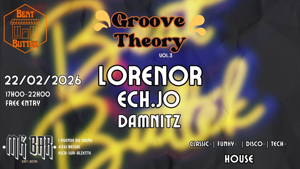 Le collectif Beat Buttek revient à son QG, le MK Bar Belval, pour la troisième édition de Groove Theory. Nous faisons disparaître la morosité hivernale avec cinq heures du meilleur de la House, Funky House et Tech House.