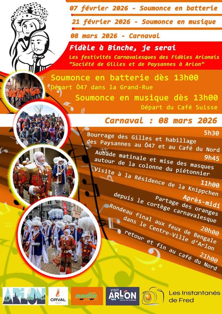 • 2026-02-21 13:00:00 2026-02-21 14:00:00 Europe/Paris Soumonce en batterie - Les Fidèles Arlonais Les festivités carnavalesques des Fidèles Arlonais Cafe Suisse - Arlon, Rue des Martyrs, Arlon, Belgique Cafe Suisse - Arlon