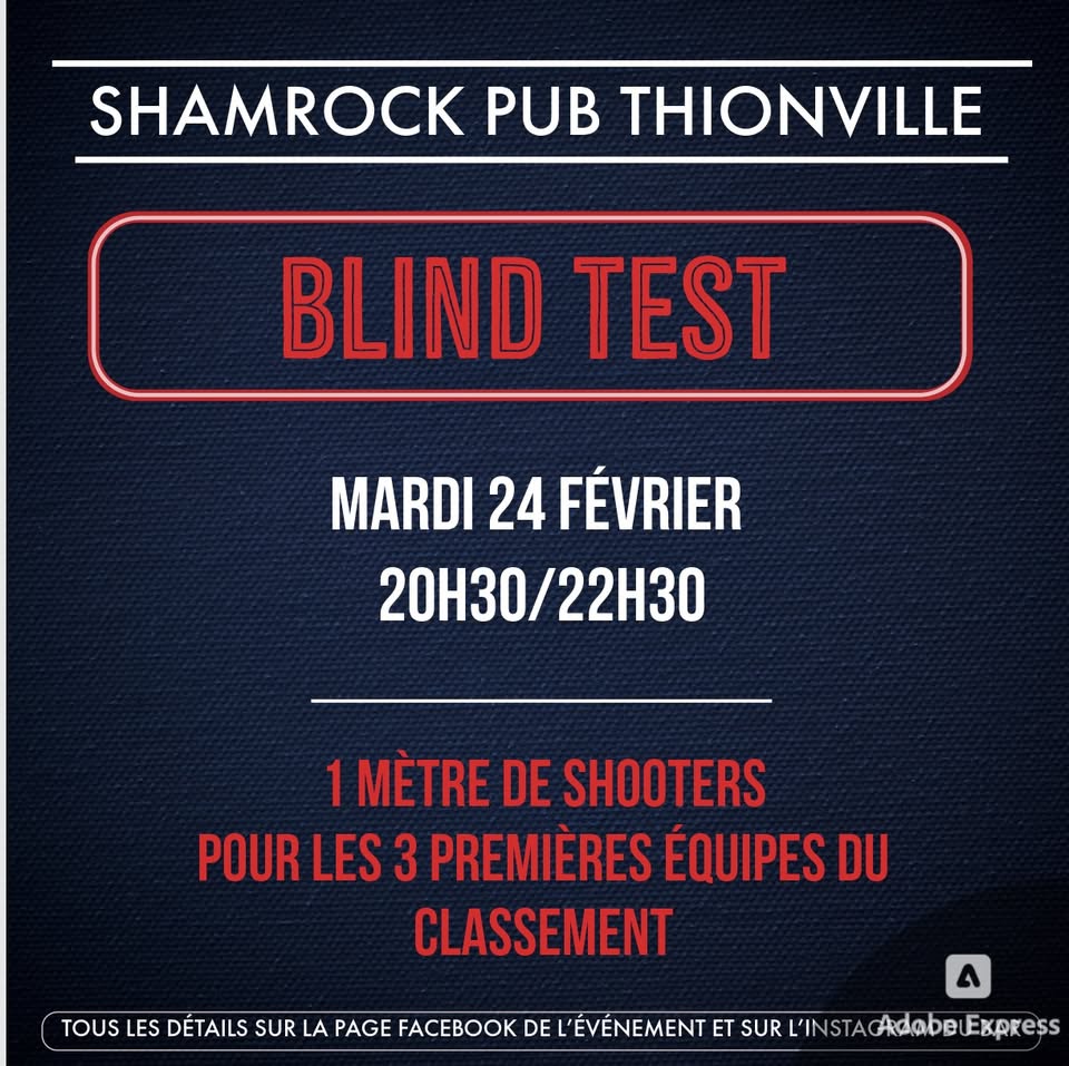 C’est Blind Test au Shamrock Pub Thionville le mardi 24 février. Pas de thème spécial : un tour d’horizons des années 80 à nos jours avec deux manches spéciales. Formez une équipe de 4 à 6 personnes maximum et venez vous mesurer aux autres. Ceux qui n’auraient pas assez de monde pourront rejoindre un autre groupe. Pensez à ramener un portable chargé par équipe, il servira de buzzer. Les 3 premières équipes du classement remporteront 1 mètre de shooters chacune.