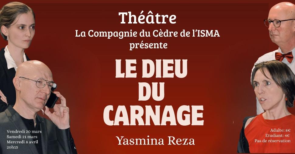 La Compagnie du Cèdre de l'ISMA vous invite à découvrir la pièce de théâtre "Le Dieu du carnage" de Yasmina Reza, interprétée par les professeurs de l'Institut Sainte-Marie Arlon. Cette comédie met en scène la rencontre entre les parents de deux enfants suite à une altercation scolaire. Ce qui débute comme une conciliation à l'amiable évolue vers une confrontation révélant les tensions et les non-dits entre les protagonistes. Les représentations incluent une dimension musicale et les bénéfices sont reversés au voyage des rhétos ainsi qu'à la caisse de solidarité de l'établissement.