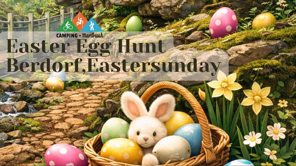 • 2026-04-05 11:00:00 2026-04-05 12:00:00 Europe/Paris Chasse aux œufs de Pâques Berdorf Le dimanche de Pâques, le sentier de randonnée B2 se transforme en une petite aventure pascale ! Dix œufs de Pâques seront cachés le long de l’itinéraire, qui débute directement au Camping Martbusch. Rapportez un œuf trouvé à la réception pour recevoir un prix. Gardez les yeux ouverts pour l'œuf d'or, qui vous permettra de gagner un prix spécial. La chasse aux œufs se déroule de manière autonome pendant la randonnée – il suffit de suivre le parcours B2. 3 beim Maartbësch, 6552 Berdorf, Luxembourg Camping Martbusch