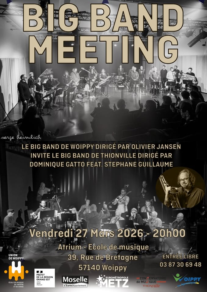 • 2026-03-27 20:00:00 2026-03-27 21:00:00 Europe/Paris Big Band Meeting Le Big Band de Woippy présentera son nouveau répertoire autour de l'album "Looking for America" de Carla Bley. En seconde partie, le Big Band de Thionville se produira avec l'invité, le saxophoniste Stéphane Guillaume. 39, rue de Bretagne, 57140 Woippy, France Union de Woippy