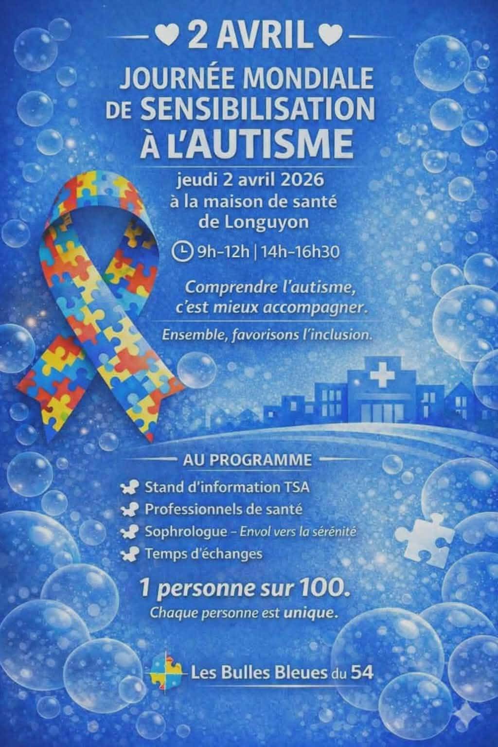 • 2026-04-02 09:00:00 2026-04-02 16:30:00 Europe/Paris Journée mondiale de sensibilisation à l'autisme Comprendre l'autisme, c'est mieux accompagner. Au programme : • Stand d'information sur les Troubles du Spectre de l'Autisme (TSA) • Présence de professionnels de santé • Intervention d'un sophrologue • Temps d'échanges Organisé par Les Bulles Bleues du 54. 7B Rue Albert Lebrun, 54260 Longuyon, France Ville de Mondelange