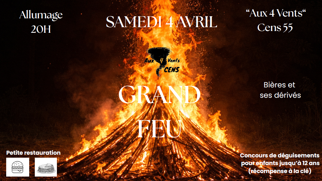 Rendez-vous le samedi 04 avril 2026 pour notre traditionnel grand feu !Au programme :Un feu pour se réchauffer et partager un moment convivial De quoi manger De quoi boire pour trinquer ensemble Des crêpes gratuites pour régaler petits et grands Une ambiance chaleureuse et festive NOUVEAUTÉ 2026 Concours de déguisements pour les enfants jusqu’à 12 ans Récompense à la clé !