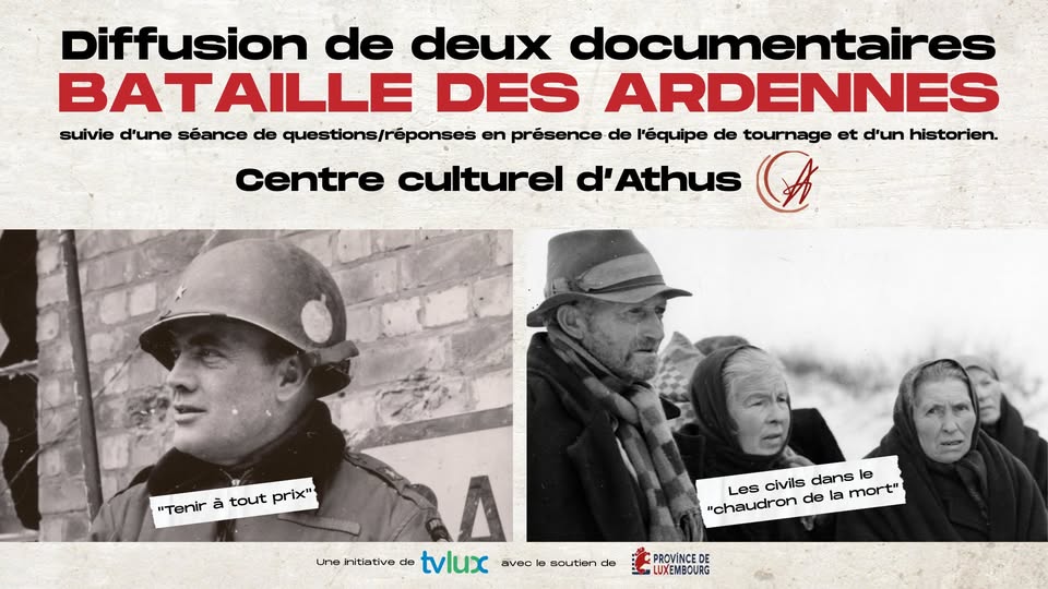 TV Lux organise la diffusion de deux documentaires consacrés à la Bataille des Ardennes (« Tenir à tout prix », « Les civils dans le chaudron de la mort ») au Centre culturel d'Athus. Le premier documentaire présente les faits marquants de la Bataille des Ardennes, le deuxième recueille des témoignages de civils ayant vécu le conflit. Après la projection, une séance de questions/réponses se tiendra en présence de l'équipe de tournage et d'un historien.