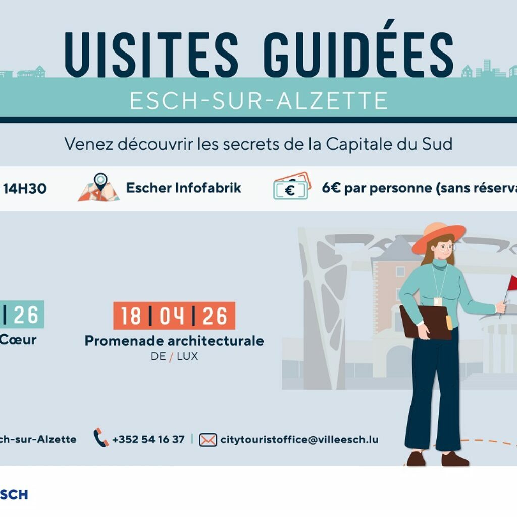 • 2026-05-16 14:30:00 2026-05-16 16:00:00 Europe/Paris Découvrez la fascinante diversité d'Esch avec nos visites guidées D'avril à octobre, profitez d'expériences uniques chaque samedi en plongeant dans l'histoire et l'architecture de la ville, ainsi que dans ses lieux incontournables et ses artefacts fascinants. Trois parcours sont proposés à différentes dates et en différentes langues : • Les incontournables d’Esch : Découvrez les points forts et les trésors cachés de la ville. • Promenade architecturale : Explorez l’impressionnante architecture et le patrimoine urbain d’Esch. • Balade historique : Partez pour un voyage à travers le temps et découvrez l’histoire de la ville. Il est également possible de suivre le parcours architectural à son propre rythme grâce à l’audioguide ou à une brochure disponible à l’Infofabrik (85, rue de l’Alzette). Office de tourisme (D'Escher Infofabrik), Rue de l'Alzette, Esch-sur-Alzette, Luxembourg Esch-sur-Alzette, Office de Tourisme