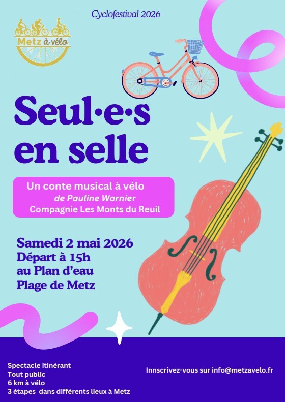 Amis du vélo, de la musique et de la nature, ce spectacle est pour vous ! Pauline Warnier arrive à Metz sur son étonnant destrier mécanique, accompagnée d’Alfred et Venticella, pour nous embarquer dans un conte musical autour du lien à la nature. Au fil d’un parcours à vélo d’environ 6 km, ponctué de pauses dans différents lieux, vous découvrirez les épisodes de cette histoire sensible et poétique. Ce rendez-vous s’inscrit dans le Cyclofestival, qui conduit Pauline Warnier de Reims à Nogent-sur-Seine, avec des étapes à Verdun, Metz, Lorry-lès-Metz et Nancy.